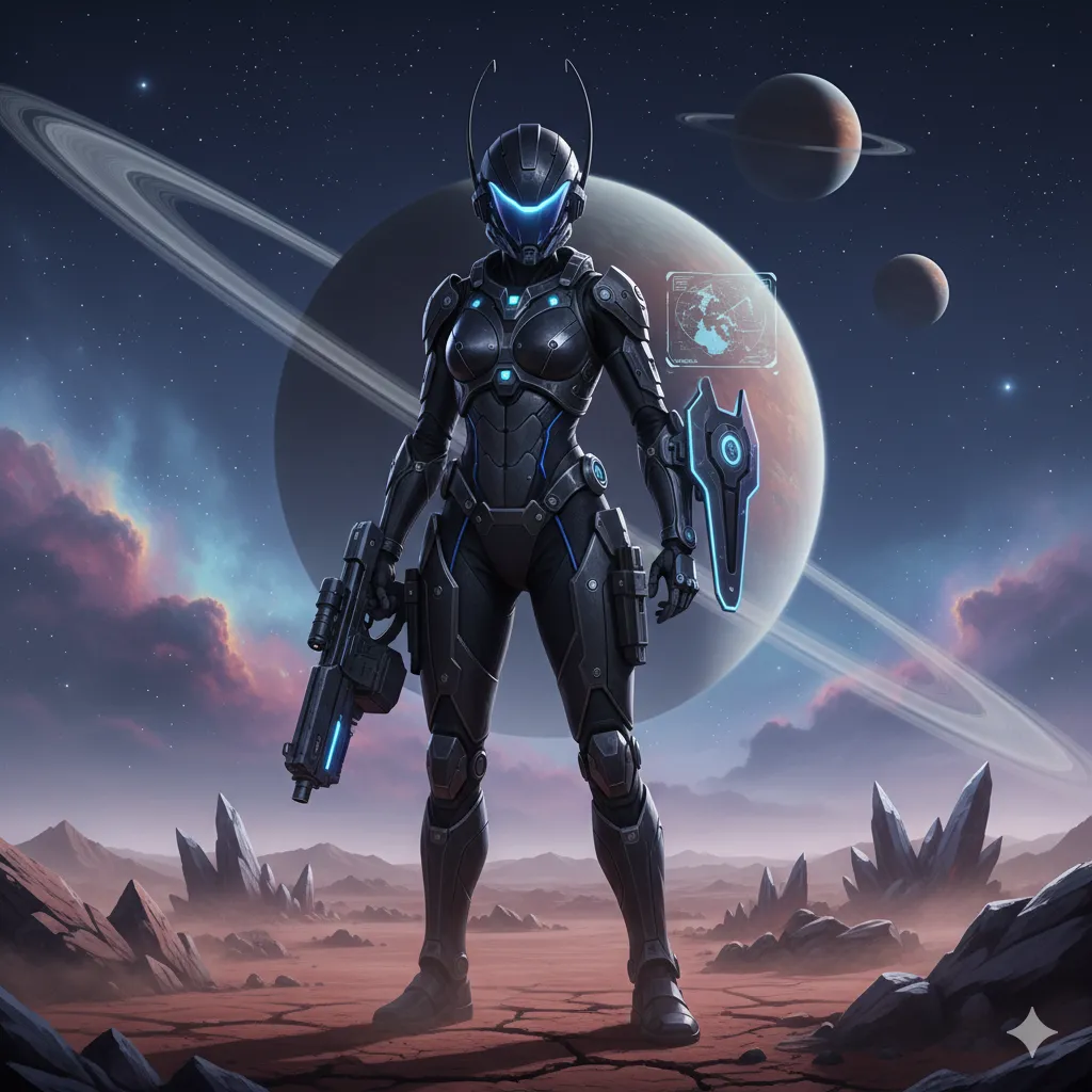 Futuristisk karakterdesign til et videospil. Inkluderer flere vinkler og animationsreferencer.